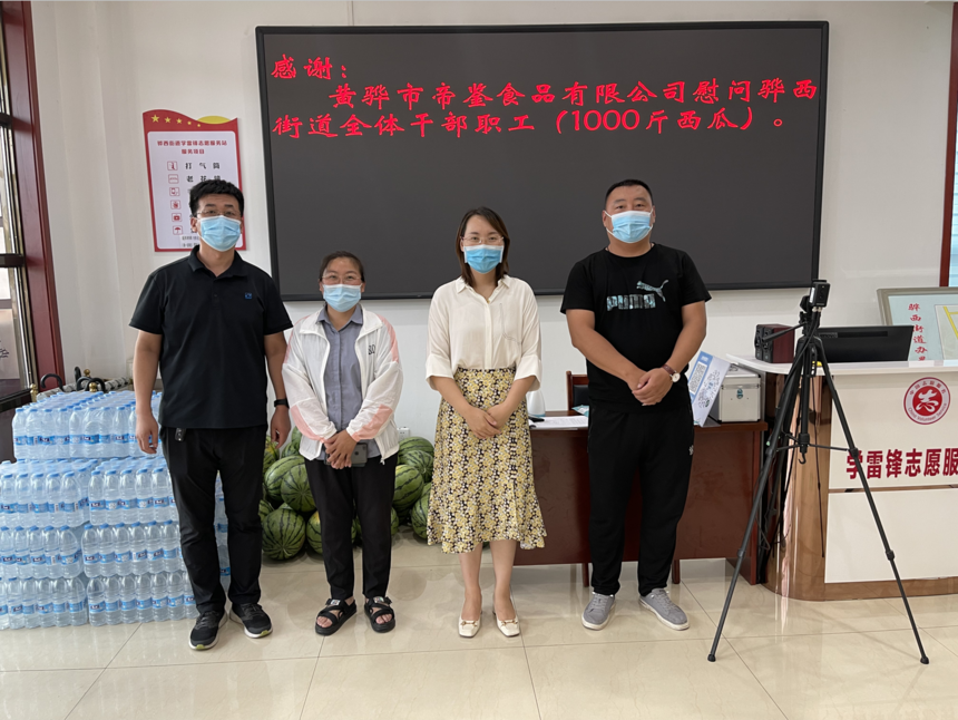 8月9日,河北帝鉴食品有限公司向黄骅市骅中街道办事处、黄骅市骅西街道办事处、黄骅市骅东街道办事处捐赠3千多斤西瓜。