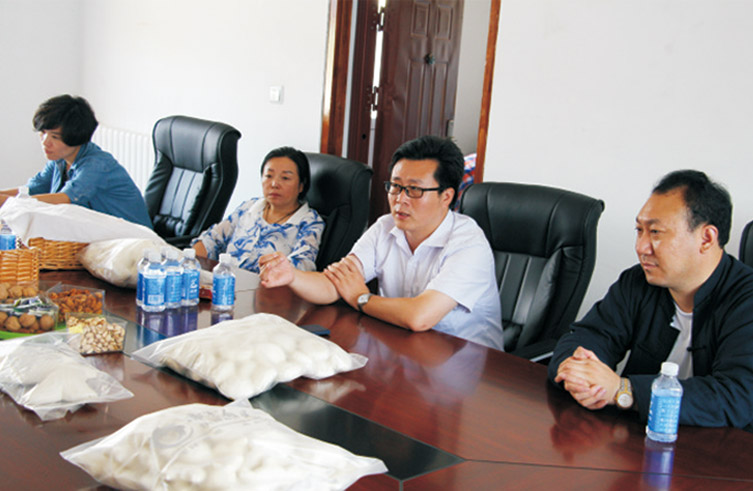 2016年7月时任黄骅市副市长王锐和帝鉴公司总经理孙建军,在帝鉴公司与北京、唐山客户就面花合作一事进行洽谈。