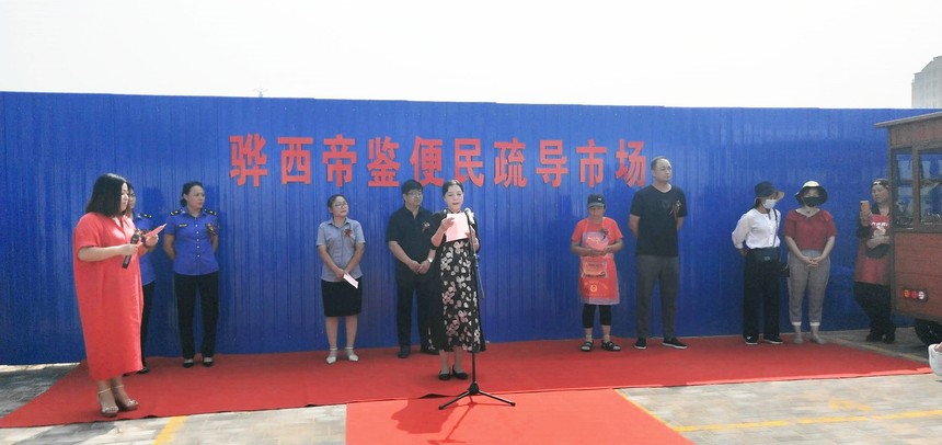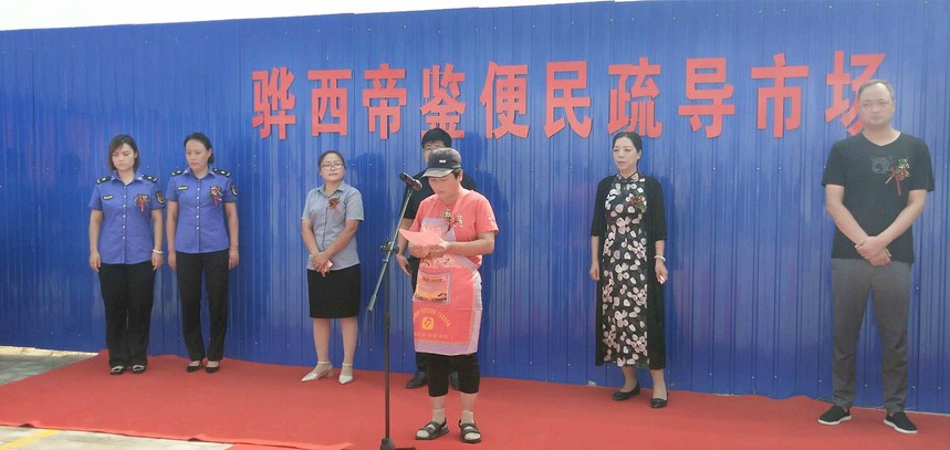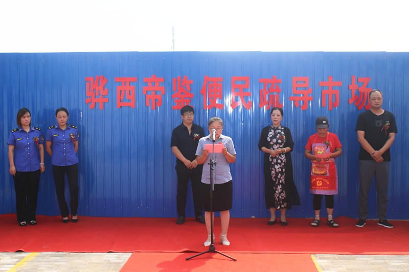活动第二项由青年南大街社区主任贾荣娥进行开业致辞。贾主任表示,骅西帝鉴便民疏导市场的设立,不仅能够使摊位经营商户可以在规范区域内做生意,广大周边居民也有了干净、放心的购买环境,这有望彻底改变以前马路市场“脏、乱、差”的现象。